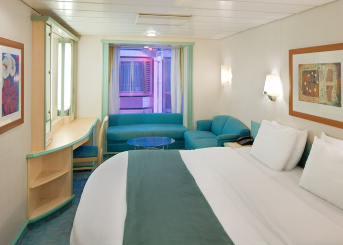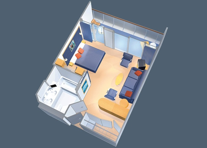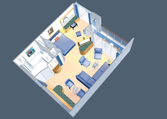 VP - Ocean View Panoramic Suite (bez balkónu) 37 m². Panoramatické neotvárateľné okná.12. paluba - vpredu. Max 6 osôb. Výhody Royal Suite Class. 6 034 € 6 034 € za osobu