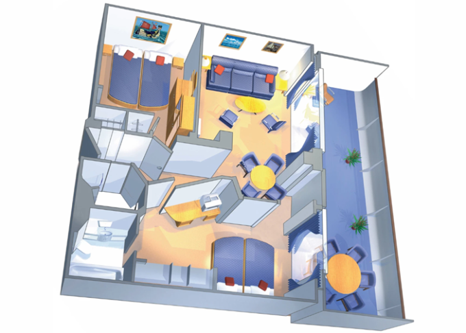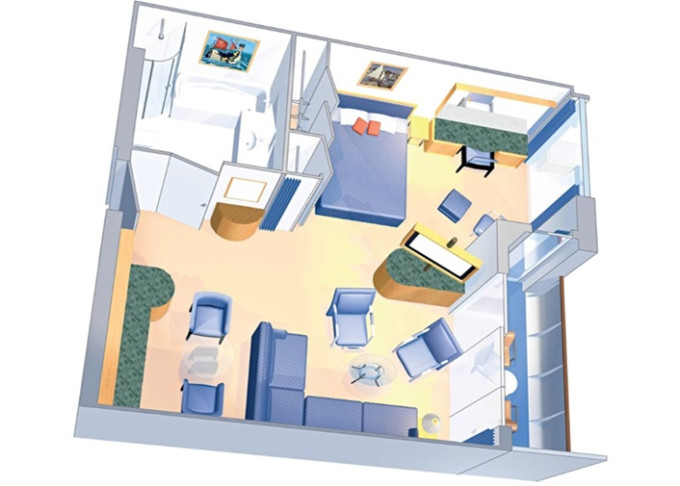 | VP - Ocean View Panoramic Suite (bez balkónu) 38 m². Panoramatické neotvárateľné okná. 12. paluba. Max 6 osôb. Výhody Suite. | 6 304 € 1 576 € za osobu | ||