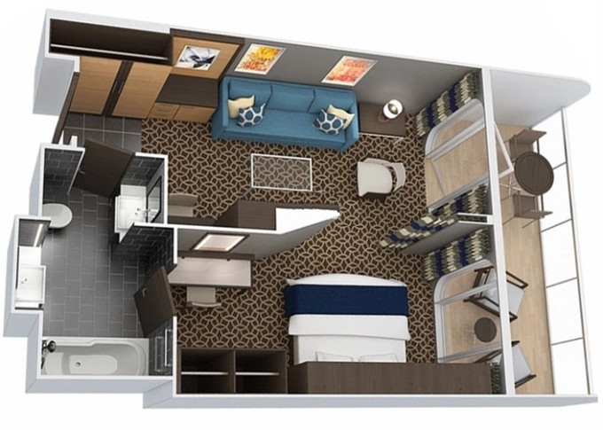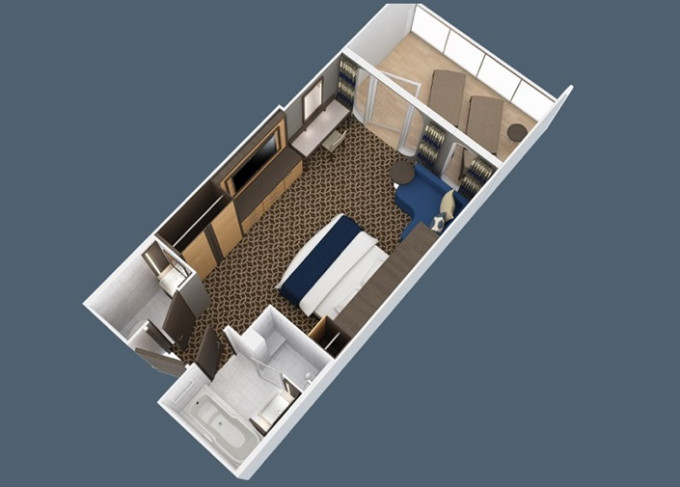 1U - Vnútorná kajuta s virtuálnym balkónom 15,5 m². Obrazovka veľkosti balkónových dverí s premietaným výhľadom. Centrálne umiestnenie. Max 3-4 osoby. 3 384 € 1 692 € za osobu