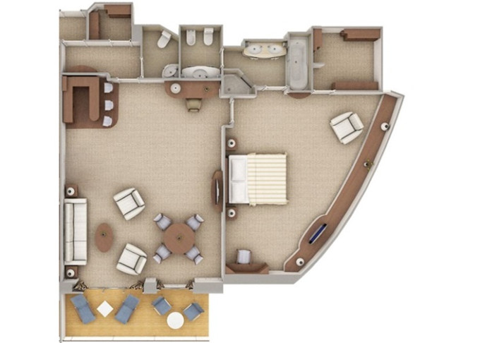 O2 - Owner's Suite 2 117 m² (vrátane balkóna 20 m²). Owners Suite O1 spojená s Vista Suite. 7. paluba stred. Max 5 osôb. 179 600 € 44 900 € za osobu