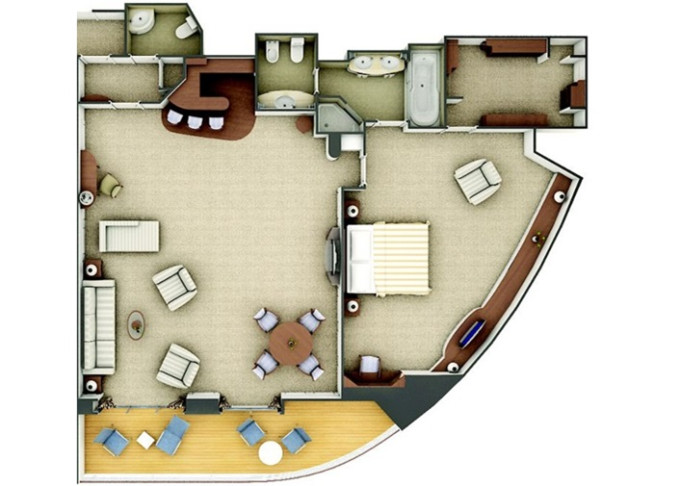R2 - Royal Suite 2 122-126 m² (vrátane balkónov 16-17 m²). Royal Suite prepojená s Veranda Suite. 6,7. paluba vpredu. Max 3 osoby. 164 000 € 41 000 € za osobu
